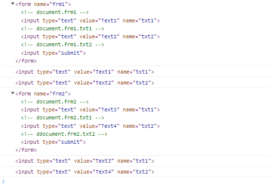 <input type=text value='Text4' name = "txt2"> <!-- ddocument.frm2.txt2 -->