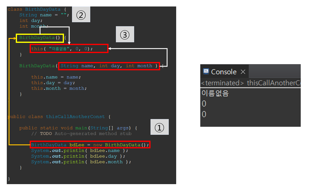 BirhDayData() default 생성자가 호출되는 경우에는 초깃값으로 "이름 없음", "0", "0" 을 할당할 수 있습니다.