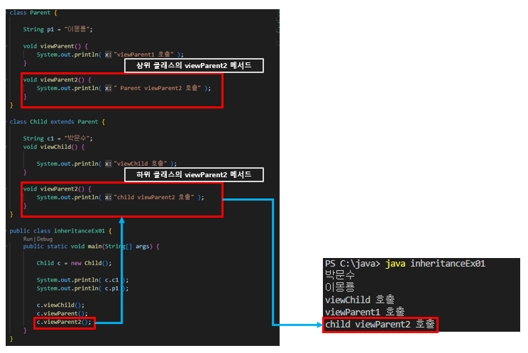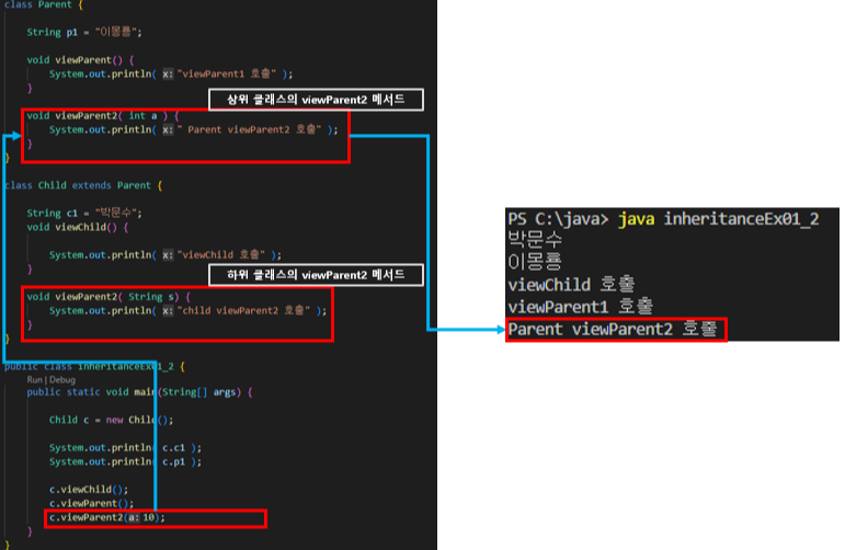 예를 들어, 상위 클래스에 viewParent() 라는 이름을 가진 메서드가 정의되어 있습니다.