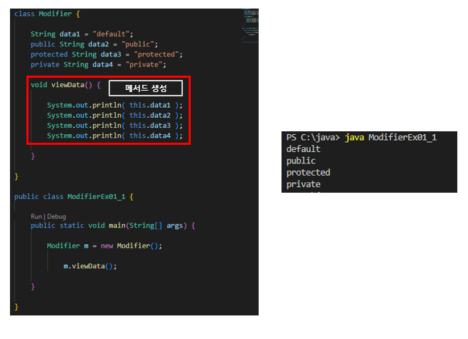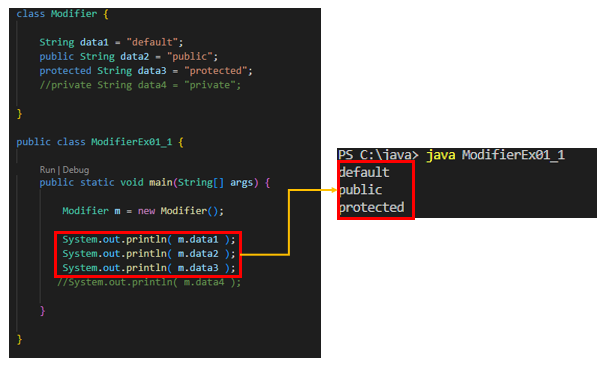 | protected | 같은 패키지 내부 또는 상속 관계의 클래스에서 접근 가능하며, 그 외 클래스는 접근 불가 |