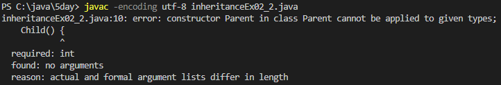 부모 클래스의 생성자로 인한 오류가 발생했다고 컴파일 오류가 출력됩니다.