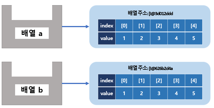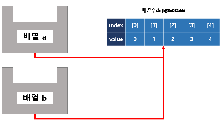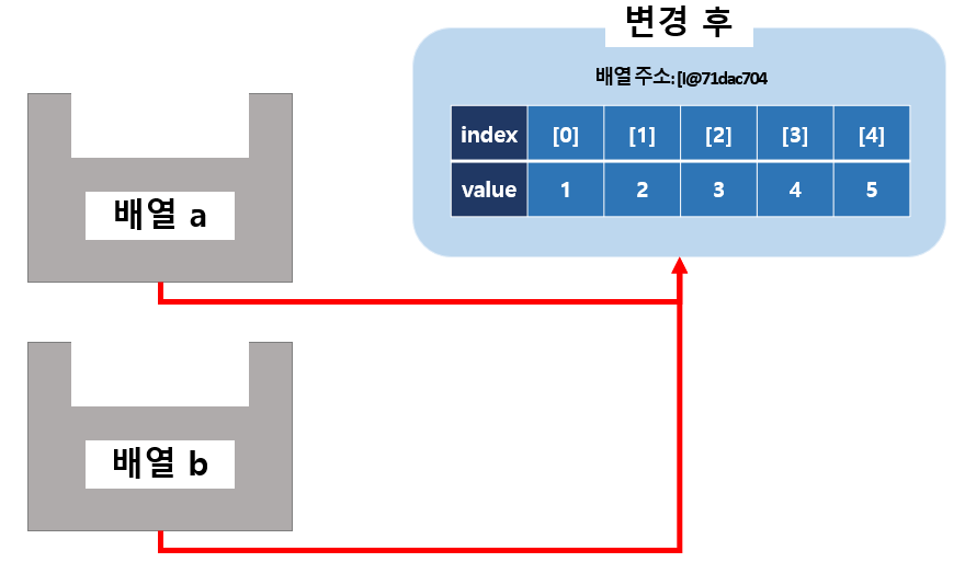 즉, a의 배열의 인덱스 [0] 의 값을 바꾸든, b의 배열의 인덱스 [0]의 값을 바꾸든