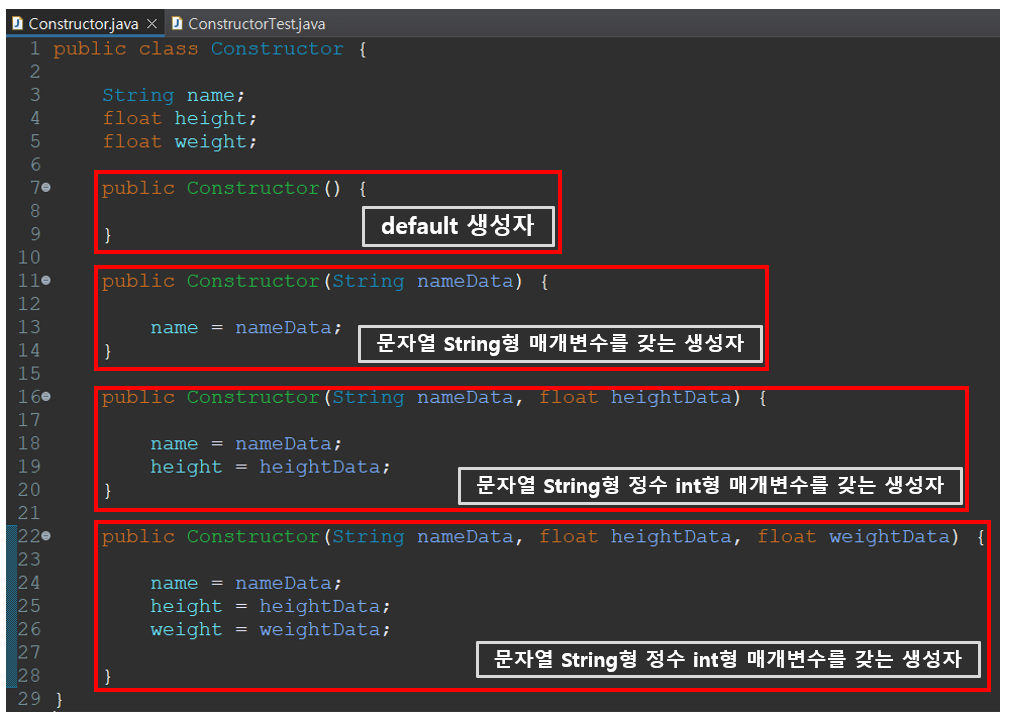 위 코드를 보면 클래스를 생성할 때 사용하는 Constructor() 같은 함수를 생성자라고 표현합니다.