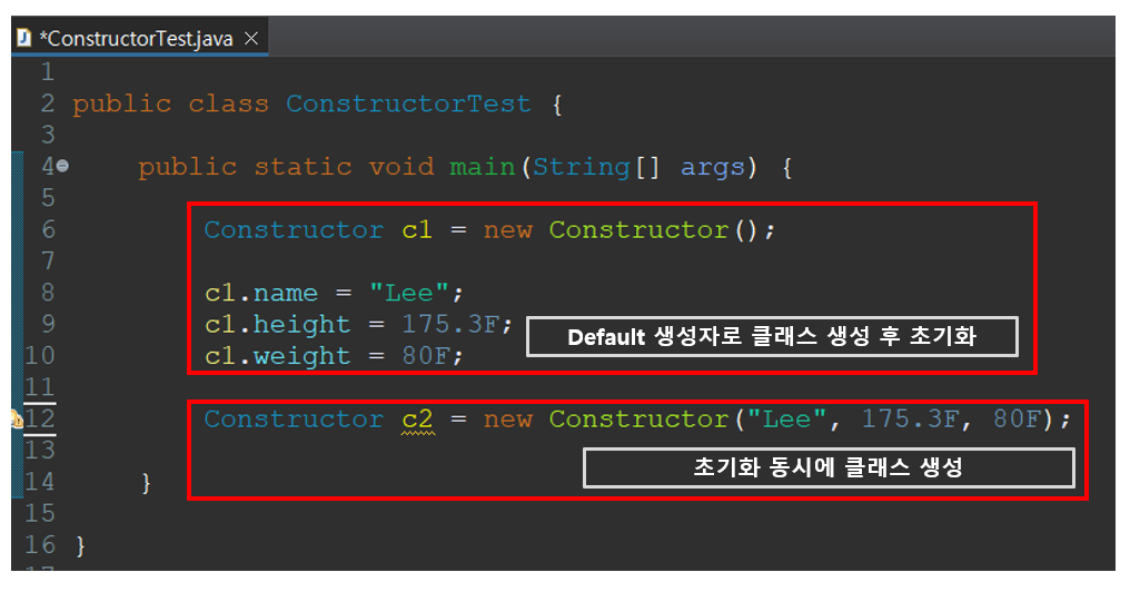 아래와 같이 Constructor 클래스를 생성할 때 두 개의 생성자를 한 개를 선택해서 초기화를 진행할 수 있습니다.