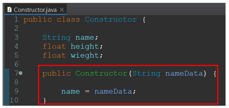 위 생성자는 문자열 String형 매개변수를 입력받아 "name"을 지정합니다.