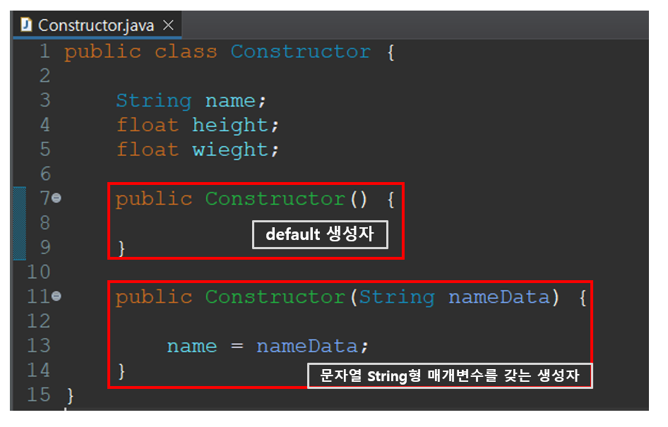 이러한 상황일 때는 default 생성자가 아닌 매개변수를 받는 생성자를 만들 수 있습니다.