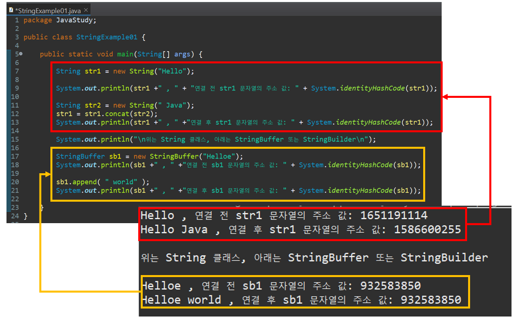 이때 사용하는 클래스가 StringBuffer와 StringBuilder 입니다.