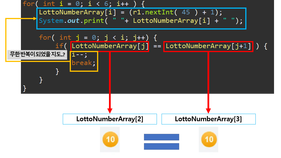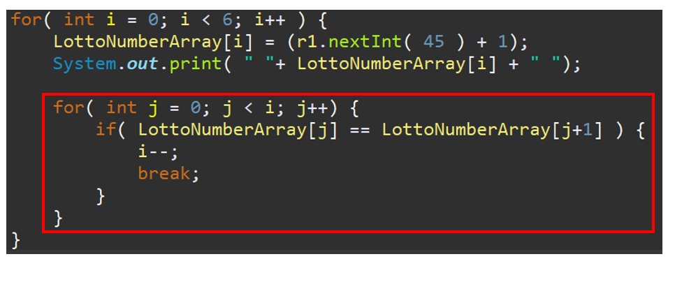 if( LottoNumberArray[j] == LottoNumberArray[j+1] ) {