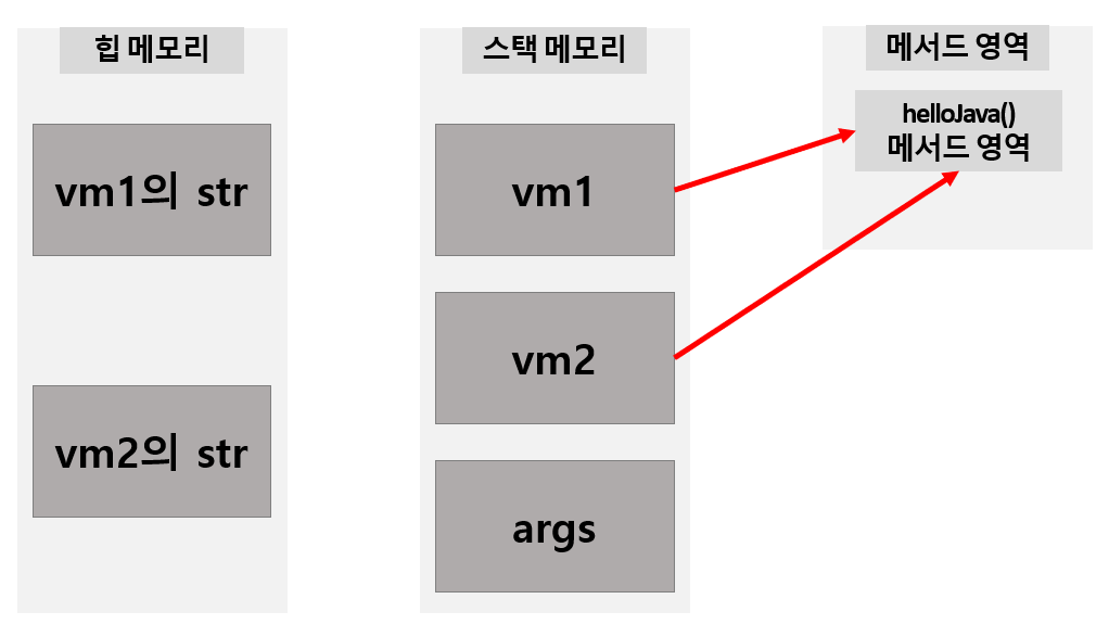 main() 메서드가 실행되면 지역 변수는 스택 메모리에 위치합니다. 각 참조 변수 vm1,vm2가 가르키는 인스턴스는 힙 메모리에 생성됩니다. 메서드의 명령 집합은 메서드 영역(코드 영역)에 위치합니다. 우리가 메서드를 호출하면 메서드 영역의 주소를 참조하여 명령이 실행됩니다. 따라서 인스턴스가 달라도 동일한 메서드가 호출됩니다.
