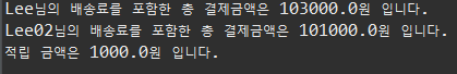 Lee01.payment( 100_000 ); //Lee님의 배송료를 포함한 총 결제금액은 103000.0원 입니다.