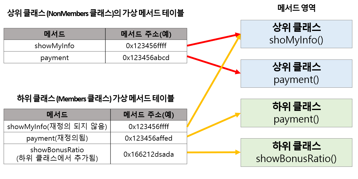 그림에서 보듯이 'payment' 메서드는 두 클래스에서 서로 다른 메서드 주소를 가지고 있습니다. 이렇게 재정의된 메서드는 실제 인스턴스에 해당되는 메서드가 호출됩니다. showMyInfo와 같이 재정의되지 않은 메서드인 경우는 메서드 주소가 같으며 상위 클래스의 메서드가 호출됩니다.