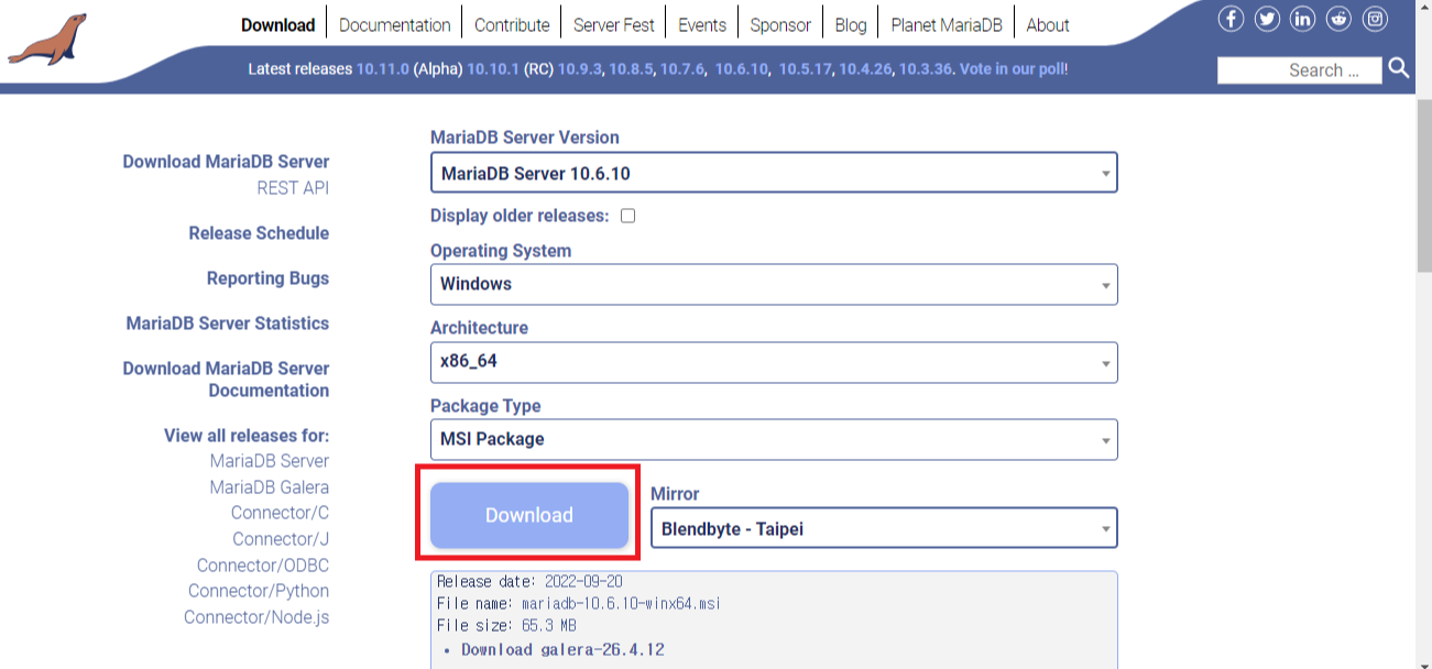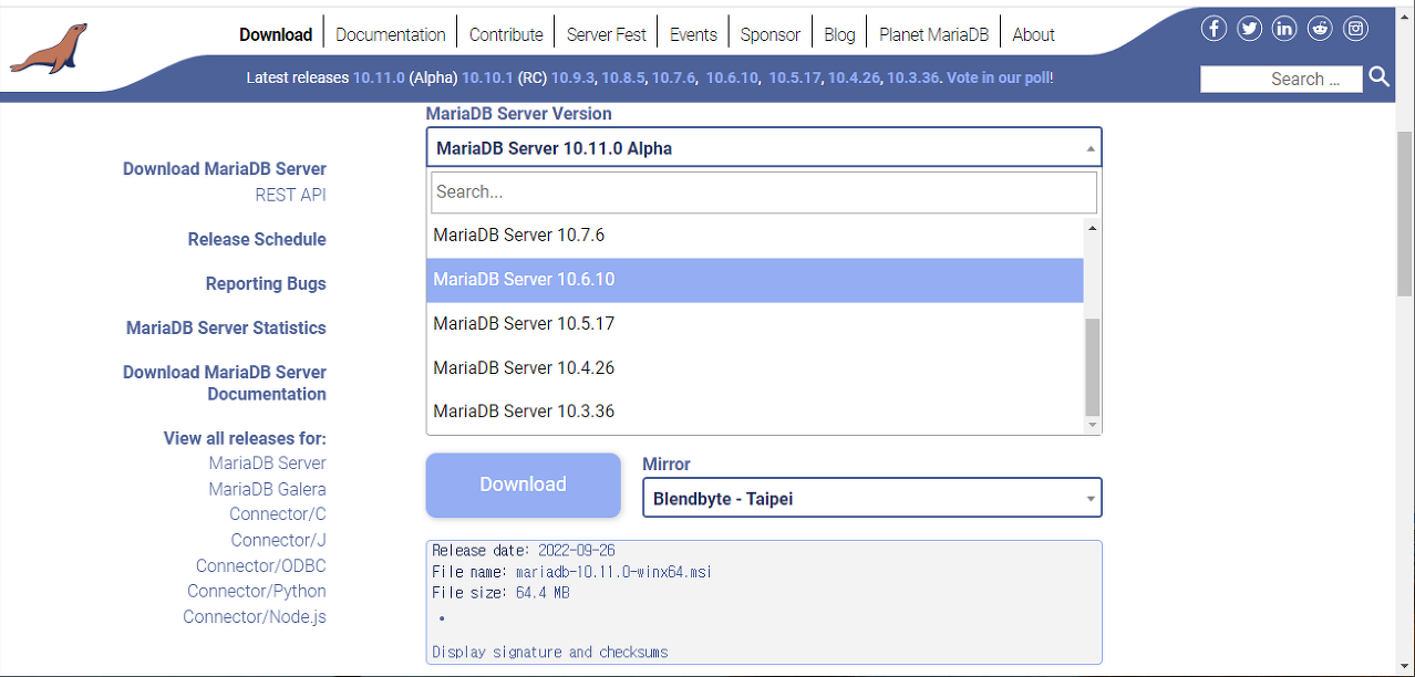 MariaDB 다운로드 할 Version 등 확인( 필자는 10.6.10 버전 사용)