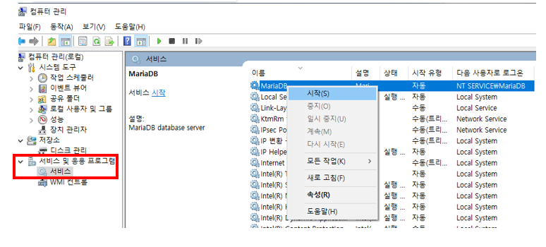 컴퓨터 관리 → 서비스 및 응용 프로그램>서비스 → MariaDB(위에서 지정한 Service Name) 우클릭