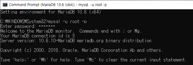 'mysql -u root -p' 를 입력 후 [Enter] 위에서 설정했던 비밀번호 입력 후 [Enter]