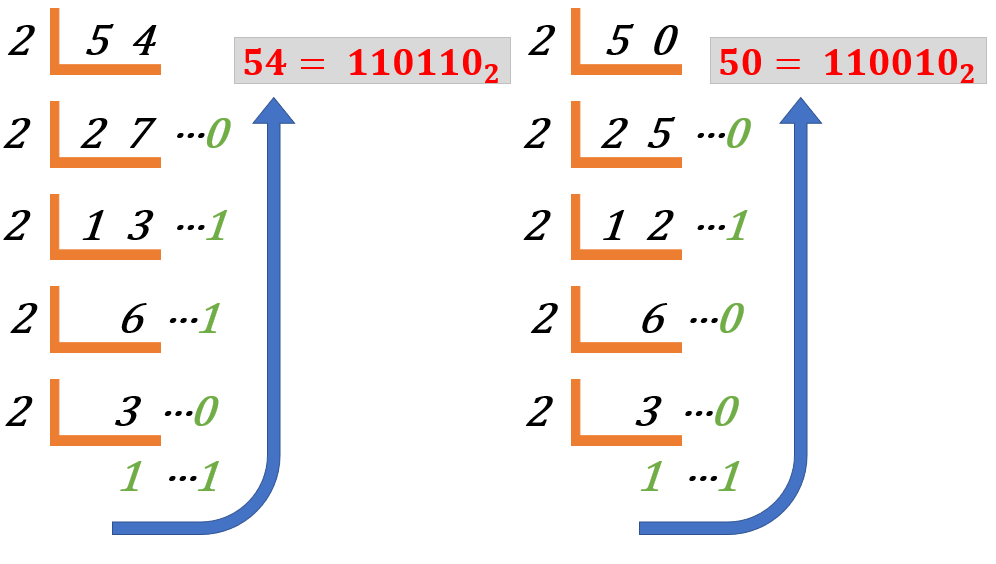 2진수의 '2가 되면 넘어간다'는 특성을 이용해 나누기로 쉽게 할 수 있습니다. 1이나 0이 나올 때까지 수를 계속 2로 나누어 주고, 중간에 나오는 나머지들을 모두 모아주는 방식입니다.