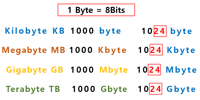 예를 들면, 같은 TB(테라바이트)여도 2진수 TB와 10진수 TB가 차이가 24GB나 차이가 나는 것을 말합니다.