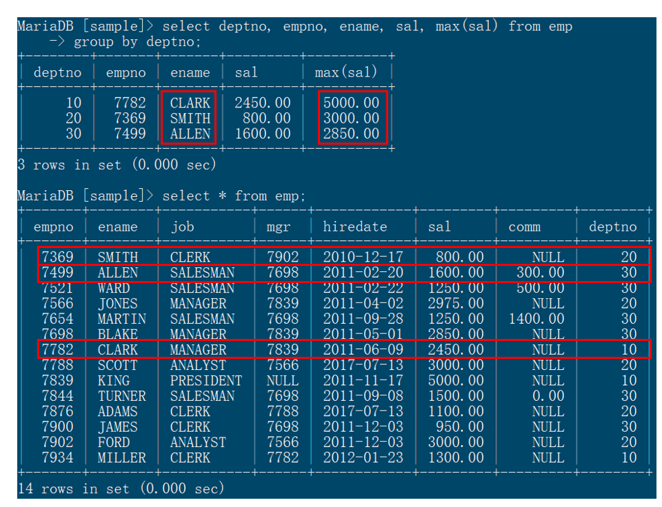 select deptno, empno, ename, sal, max(sal) from emp