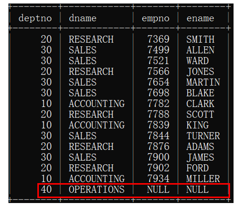 위에서는 출력이 되지 않았던 부서번호(dept) 40번이 출력된 것을 확인할 수 있습니다.