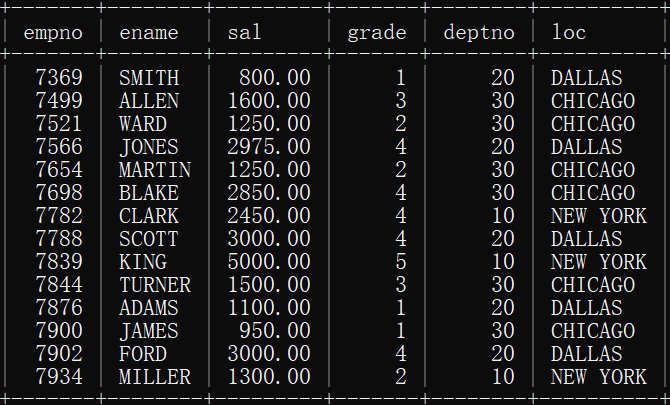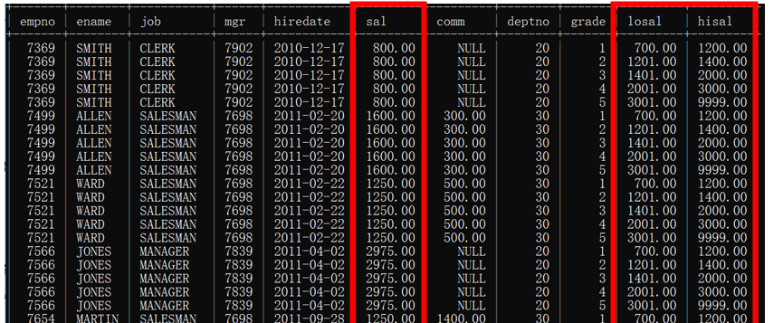 -> on (e.sal >= s.losal and e.sal <= s.hisal);