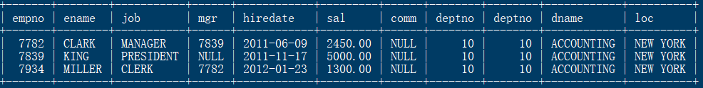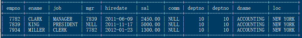 -> where emp.deptno = dept.deptno and emp.deptno = 10;