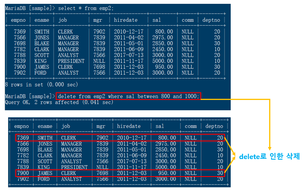 DELETE FROM [ 테이블 ] WHERE [ 조건 ]