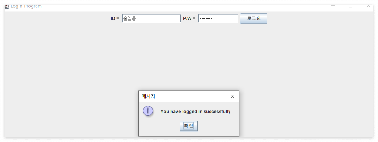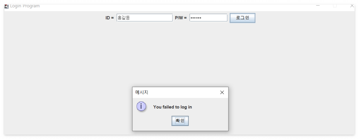 | * String pw의 변수 값(비밀번호)를 "강아지1"로 선언후 로그인 → 로그인 실패("You failed to log in") |