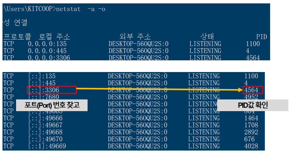 2. Kill 하고자하는 포트를 로컬 주소 컬럼(세로 줄)에서 찾고, 그에 맞는 PID 값을 확인