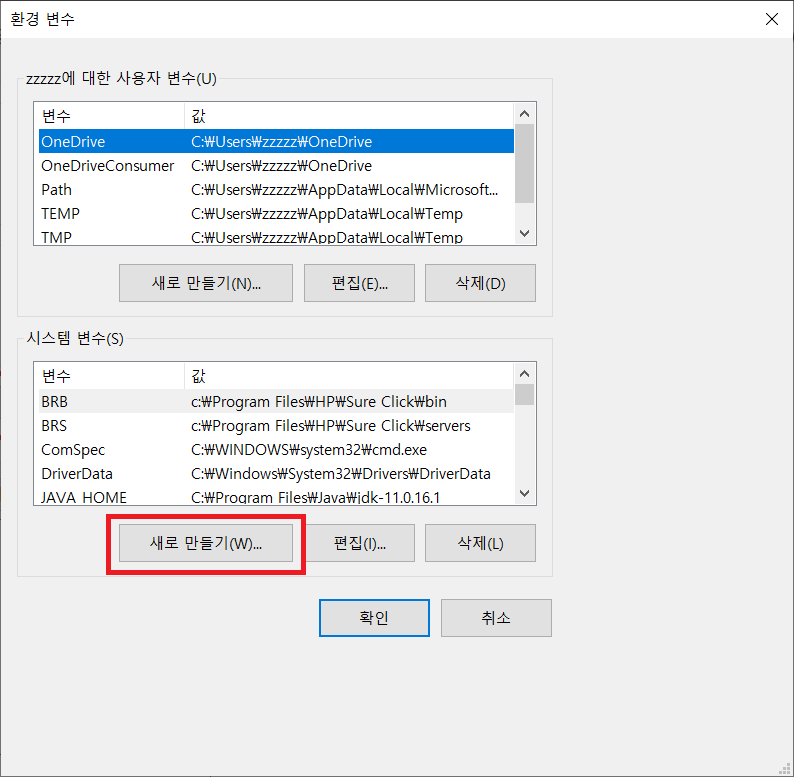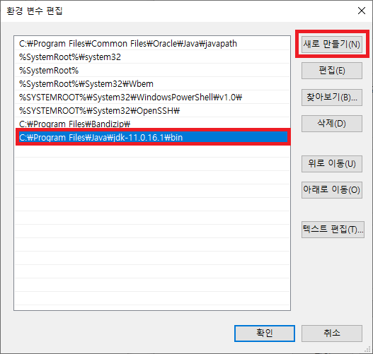 - 변수 값: C:\Program Files\Java\jdk-11.0.16.1(본인 jdk 설치위치)