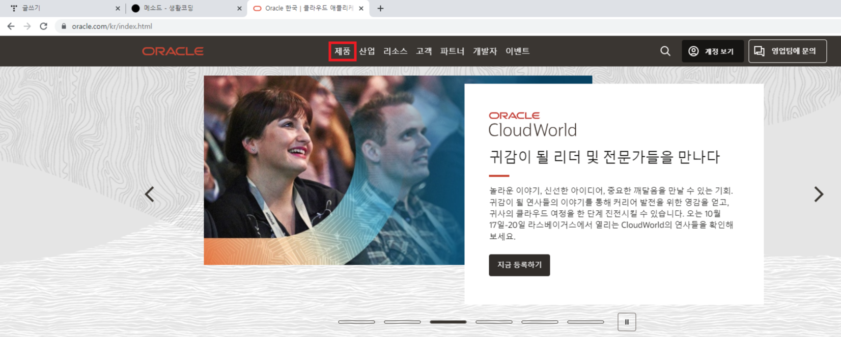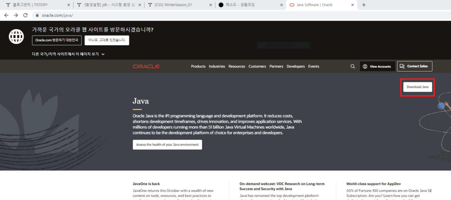 1) 아래 오라클 접속 → 상단 탭 "제품" → 하드웨어와 소프트웨어 "자바" → Download JAVA
