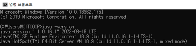 환경 설정 완료 후 cmd 실행 후 "java -version" 명령을 통해 확인