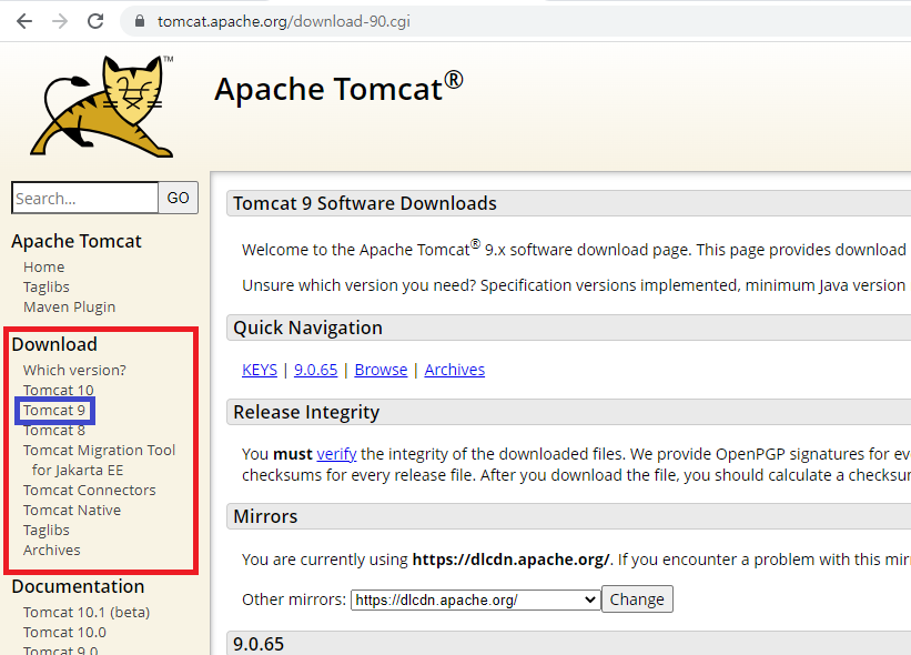 빨간 좌측 박스의 "Tomcat 9" 클릭