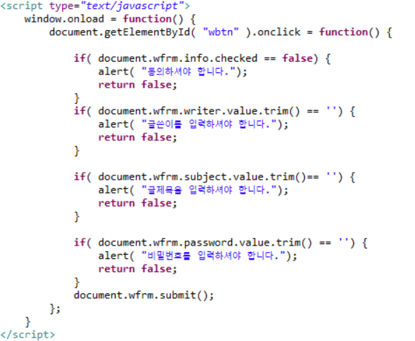 3. javascript 코드는 아래와 같이 작성되었습니다. 버튼을 눌렀을 때 각 항목의 값이 제대로 들어가 있나 확인합니다. 이는 DB에서 각 컬럼에 특성과 관련이 있습니다. 데이터를 insert할 때 필수값 인지(not null 또는 primary key 또는 unique).. 에 따라서 얼마든지 변경될 수 있습니다.