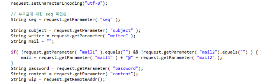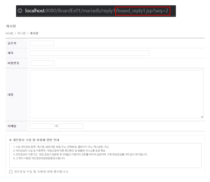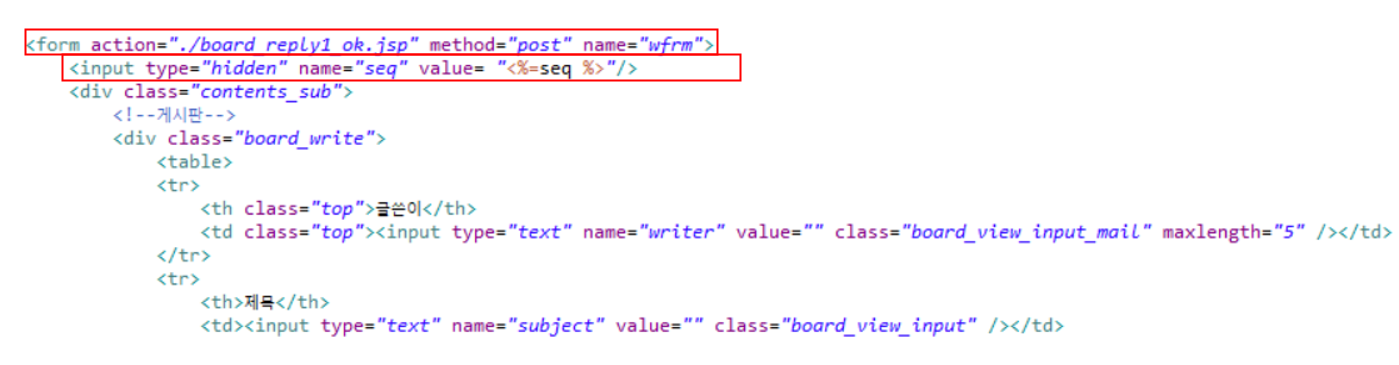 2. 버튼 클릭시 board_reply1.jsp 파일을 요청하며 톰캣은 이 jsp 파일을 java 파일로 생성하여 웹 브라우저에 전달합니다. 위에 내용과 같이 seq(게시글 번호)도 같이 보냅니다. 글쓴이, 제목, 비밀번호를 다 작성합니다.