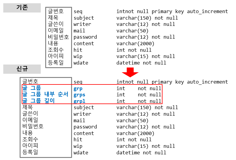 - grps(글 그룹 내부 순서)는 부모글과 같은 grp 번호라면 해당한다.