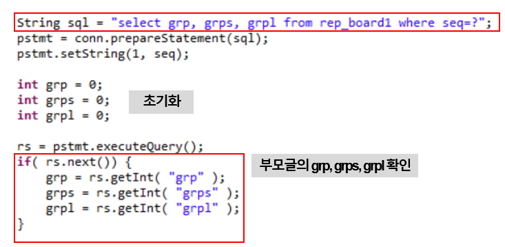 5. 우선 전달받은 seq(댓글을 쓰려고 하는 부모글의 번호)를 통해서 grp,grps,grpl을 확인합니다.