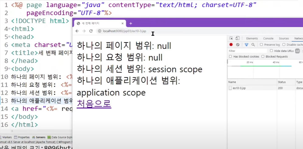 웹브라우저에서 서버쪽으로 request(요청)를 하면 요청 정보(헤더, 파라미터 정보)가 담긴 request객체가 생성됩니다.