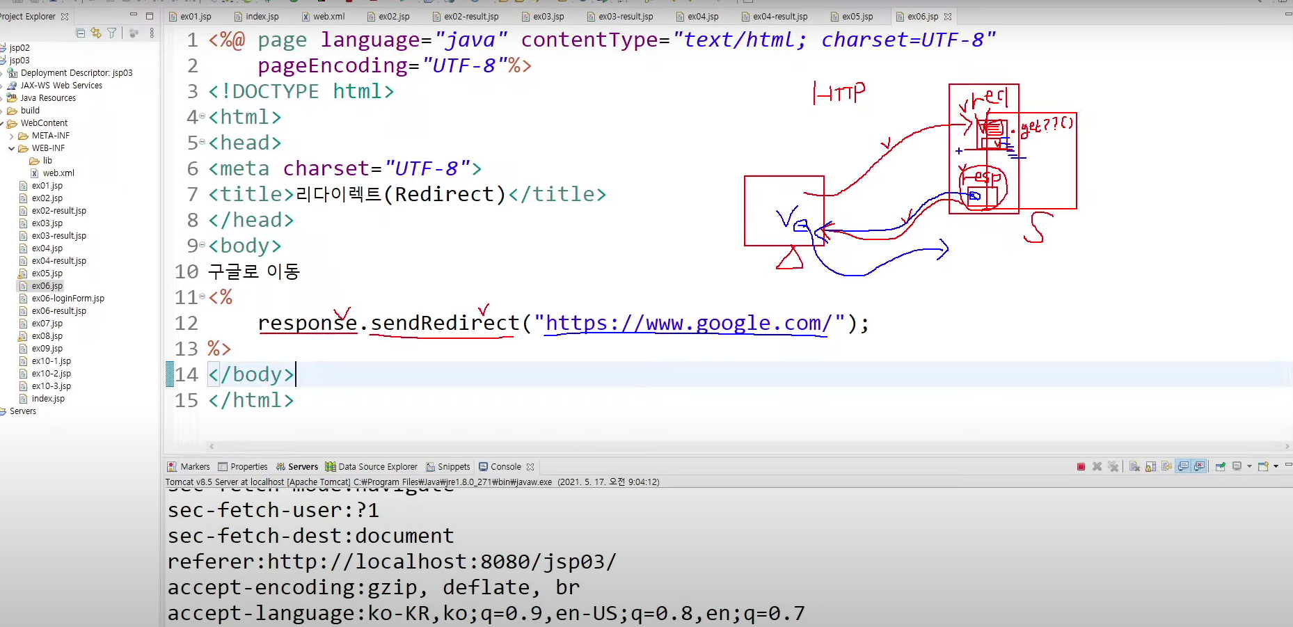 sendRedirect() 메서드는 별다른 결과값이 없을때 또는 처리를 하고 끝나는 상황이라면 다른 곳으로 요청하도록 링크를 만들어줍니다. 이를 받은 웹브라우저는 전달받은 url로 이동합니다.