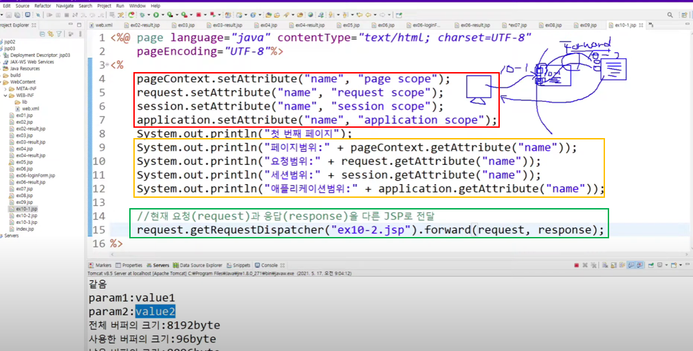 웹 브라우저에서 10-1번으로 요청을 했을 때는 서버에서는 처리를 하며, 생성된 request 객체와 response 객체를 10-2번으로 그대로 전달(forwarding)해주는다는 의미이다.