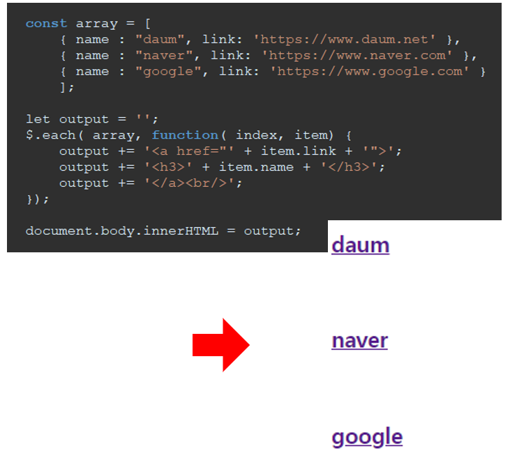 선택자로 선택한 요소(문서 객체)는 배열에 순서대로 저장됩니다. 이때 each()와 $.each() 메서드는 배열에 저장된 요소를 순서대로 하나씩 선택하면서 인덱스 정보를 가져옵니다.