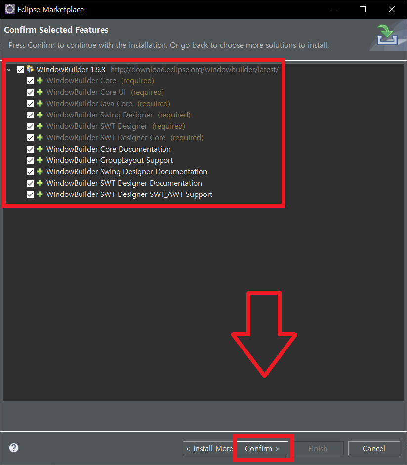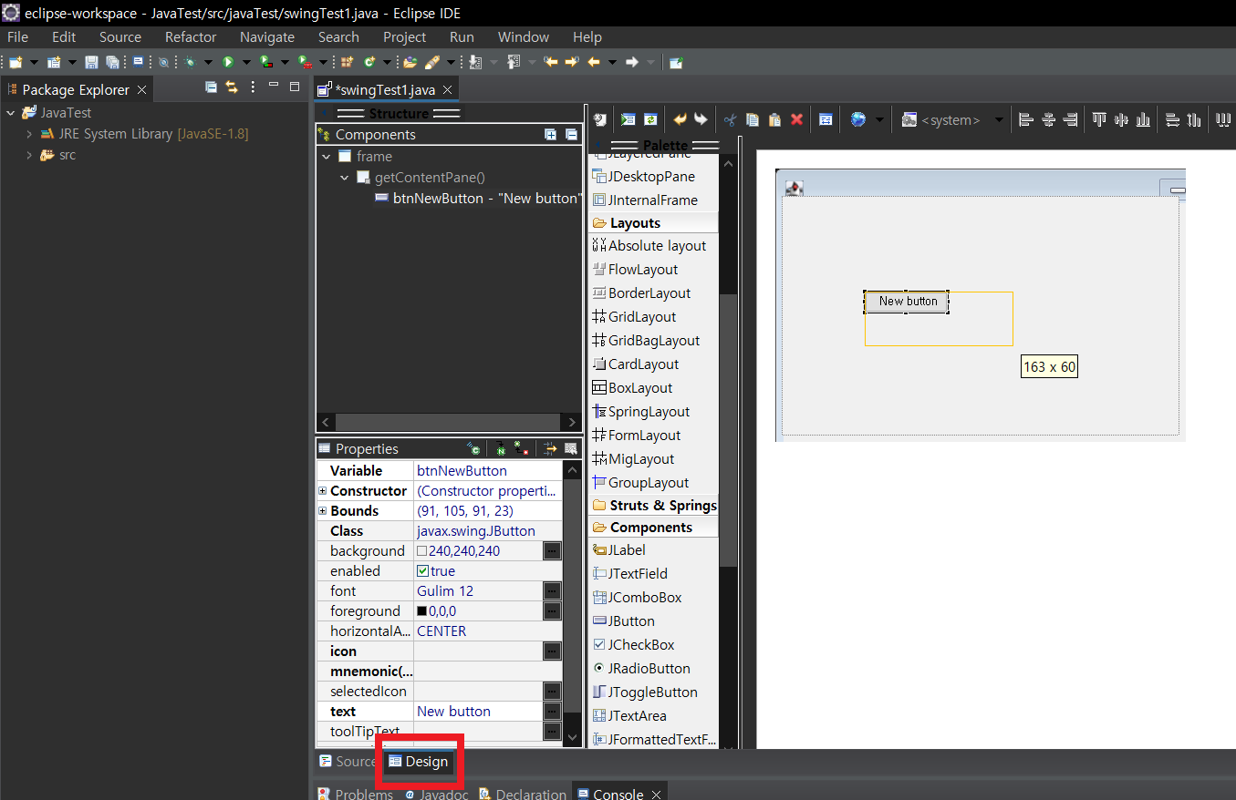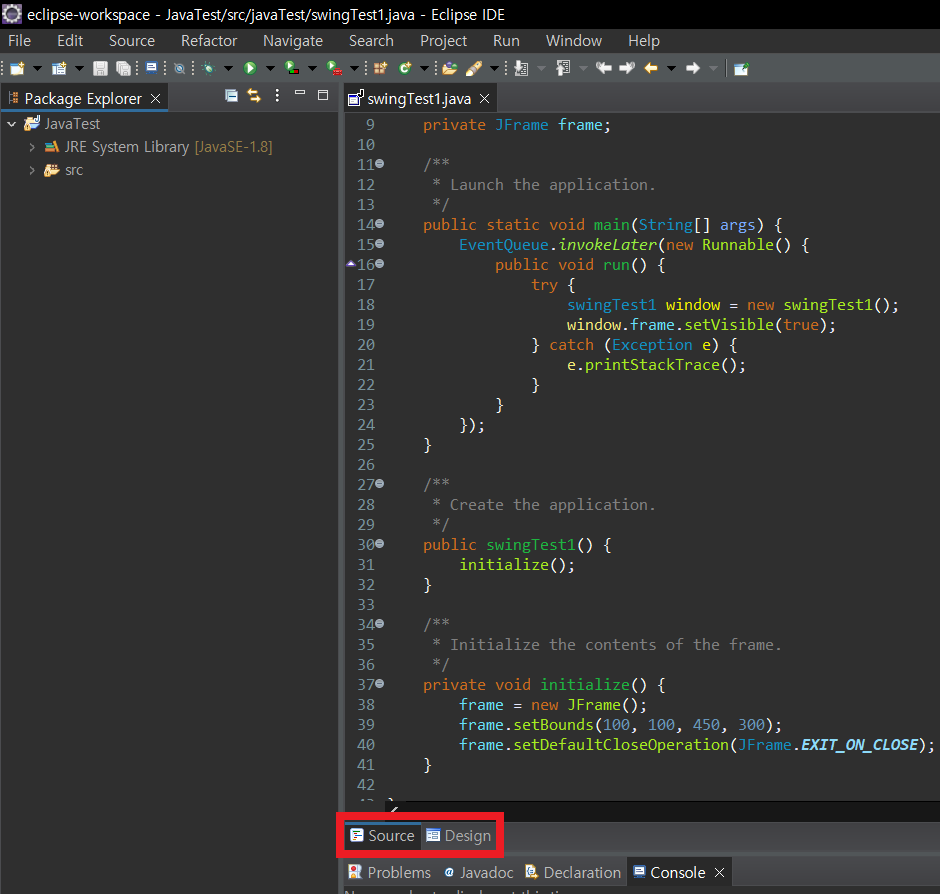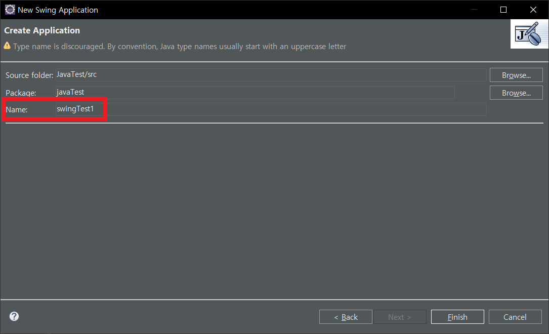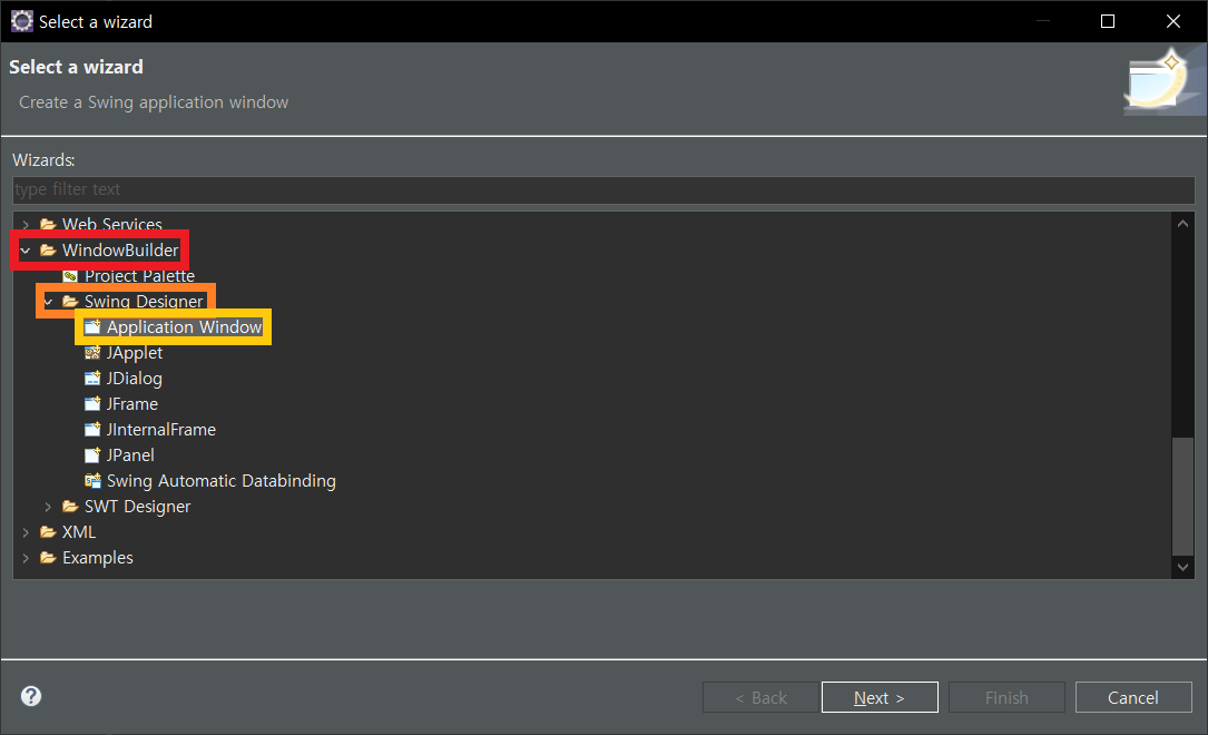 [WindowBuilder>Swing Designer>Application Window] 선택 후 Next >