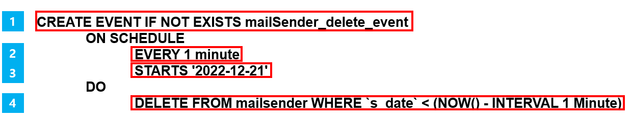 - 테이블명 mailsender의 s_date 컬럼을 삭제하는데 현재 기준으로 1분을 뺏을 때가 발송 시점보다 크다면 그 데이터는 삭제한다.