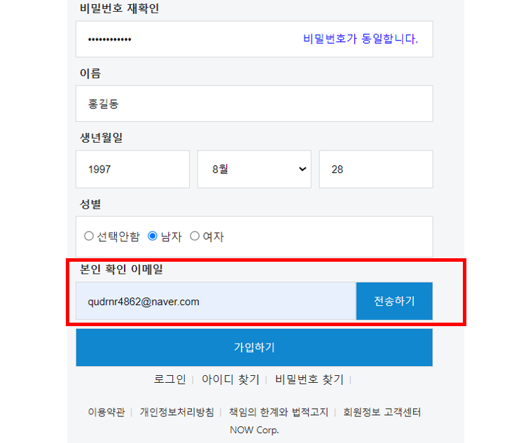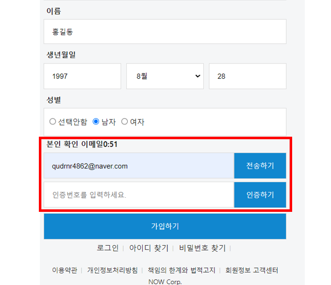 사용자가 이메일을 입력 후 전송하기 버튼을 클릭하면 해당 이메일로 인증번호가 발송된다.