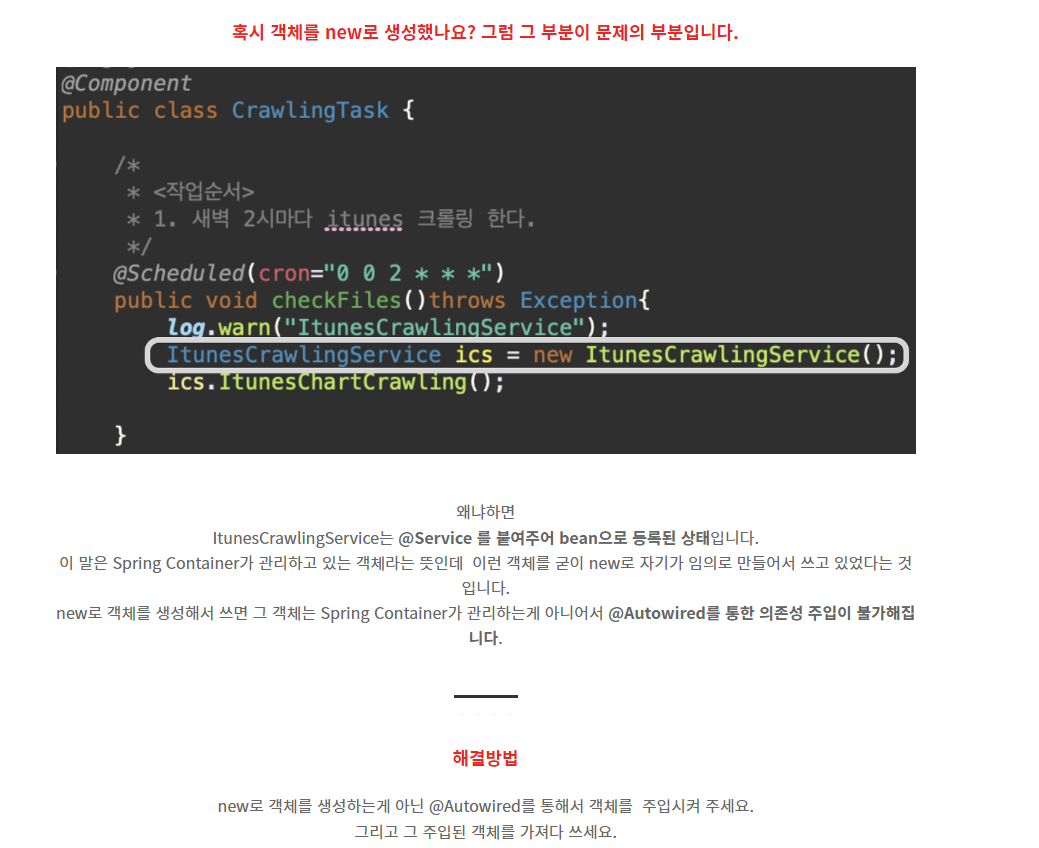 Spring [Spring] @Autowired에도 NullPointException 에러가 발생할 경우 by bkuk 2023. 2. 10. 스프링 컨테이너에 의해서 관리되고 있는데, 어딘가.. 객체를 생성한 것이다 공유하기 게시글 관리 생각하고 정리하는 곳 저작자표시 (새창열림) 'Spring' 카테고리의 다른 글 [Spring] @RequestParam / Command 객체 사용시 DTO(Data Transfer Object) 클래스에 명시되지 않은 변수를 포함하고 싶은 상황 / DTO에 없는 멤버 변수의 파라미터 정보 (0) 2023.03.06 [Spring] request.getParameter() 대체 / Spring의 Command 객체 /Controller에서 사용자 입력 정보를 getParmeter() 메서드가 아닌 Command 객체를 이용해서 구현 (0) 2023.03.06 [Spring] ViewResolver를 적용했을 때, 이를 무시하고 리다이렉트 디시키는 방법 / redirect: (0) 2023.03.06 [Spring] 빈(Bean) 등록을 위한 어노테이션(Annotation) 설정 / @Configuration (0) 2022.12.27 [MyBatis] 동적 SQL / parameterType이 TO클래스가 아닌 java.util.List 클래스로 전달 후 insert / <foreach> 활용 (0) 2022.12.23 관련글 [Spring] request.getParameter() 대체 / Spring의 Command 객체 /Controller에서 사용자 입력 정보를 getParmeter() 메서드가 아닌 Command 객체를 이용해서 구현 [Spring] ViewResolver를 적용했을 때, 이를 무시하고 리다이렉트 디시키는 방법 / redirect: [Spring] 빈(Bean) 등록을 위한 어노테이션(Annotation) 설정 / @Configuration [MyBatis] 동적 SQL / parameterType이 TO클래스가 아닌 java.util.List 클래스로 전달 후 insert / <foreach> 활용