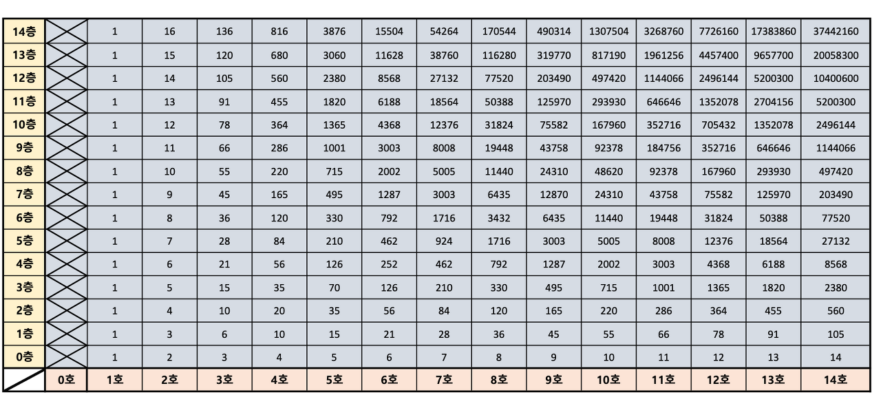 - 따라서 이 문제는 0층 1호 ~ 14호 까지 대입하고, 0층 정보를 통해서 값을 대입해야 한다.