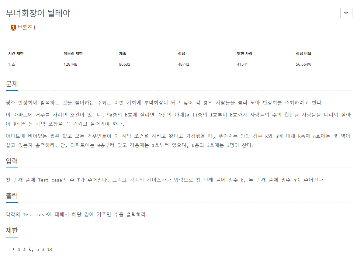[BaekJoon] 백준 알고리즘 2775번 / 부녀회장이 될테야