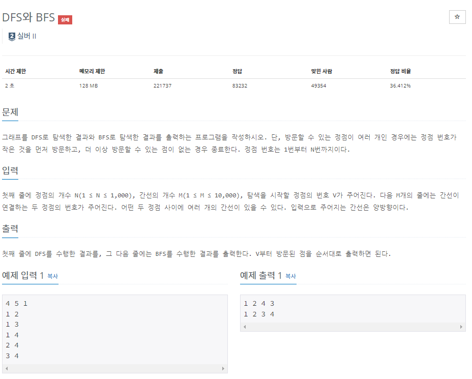 [BaekJoon] 백준 알고리즘 1260번 / DFS와 BFS / Python
