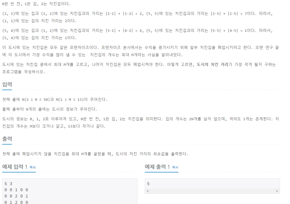 minSum += minValue # m개의 치킨집 중 가장 가까운거리 탐색