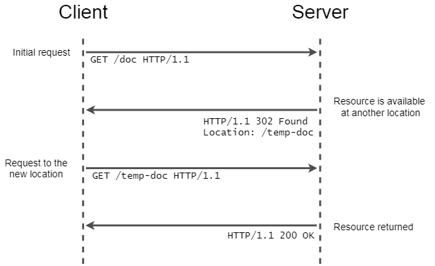 클라이언트는 첫 라인의 상태 코드를 확인한 후 302라면 Location 값을 읽어 서버에 재요청을 보내게 된다. 다시 한번, 이에 따른 서버에 응답을 주게 된다.