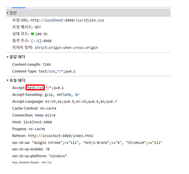 따라서 URI의 확장자가 css인 경우 헤더 값을 text/css로 응답을 보내도록 구현해야 한다.