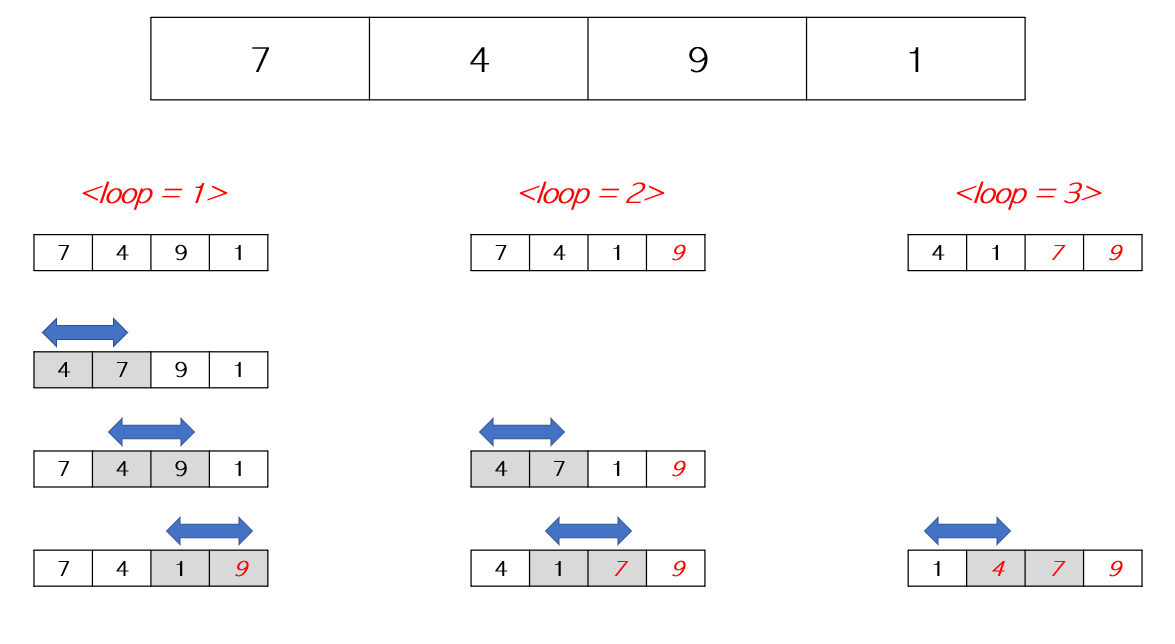 오름차순으로 정렬을 위해서 loop for문 안에 추가적인 for문을 통해 i가 "(array.length - loop - 1)" 보다 작아질 떄 까지 반복